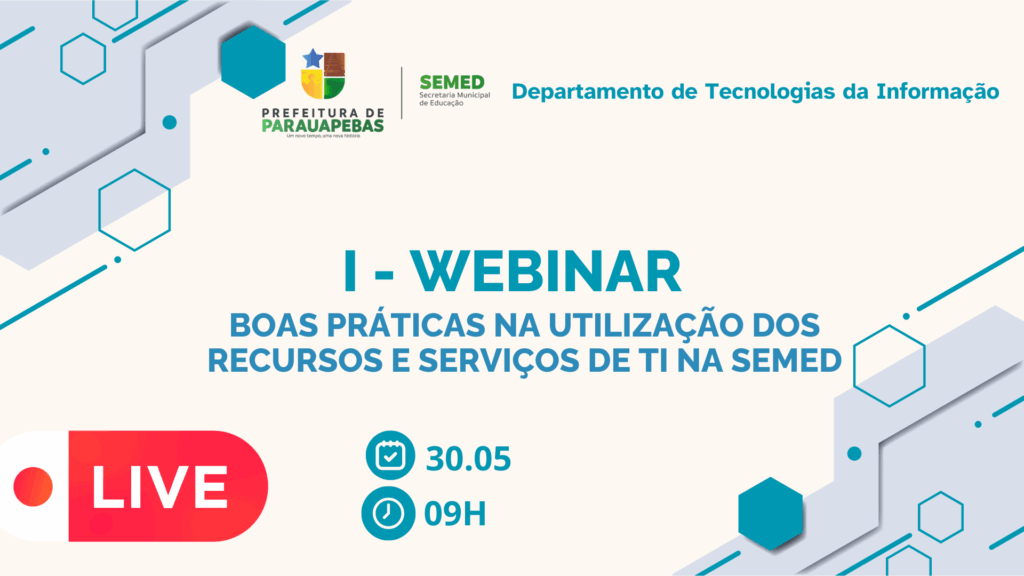 Webinário sobre Boas Práticas na Utilização dos Recursos e Serviços de TI. Sabemos que a tecnologia é uma ferramenta indispensável em nosso dia a dia, desde a gestão de documentos até a comunicação com as escolas. Pensando nisso, preparamos este encontro para compartilhar informações e dicas valiosas que otimizarão o uso de nossos sistemas, equipamentos e serviços de suporte. Neste webinário, abordaremos temas como: Abertura e Gerenciamento de Chamados: Como solicitar suporte de forma ágil e eficaz. Segurança da Informação: Orientações essenciais para proteger nossos dados. Melhor uso dos equipamentos: Dicas para garantir a durabilidade e o bom funcionamento de notebooks, impressoras e outros dispositivos. Sua participação é crucial! Ao aplicarmos essas boas práticas, fortaleceremos a infraestrutura de TI da SEMED e garantiremos que a tecnologia seja uma aliada ainda mais poderosa em nossas atividades diárias. Data: 30 de maio Horário: 09h Local: https://www.youtube.com/live/__jwr7MoumI Público-Alvo: Servidores da Secretaria Municipal de educação de Parauapbepas. – Palestrante: Rogério Alves/ Coordenador de Tecnologia da Informação/SEMED.